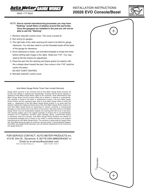 - For Use w/2-1/16 in. Auto Meter Gauges