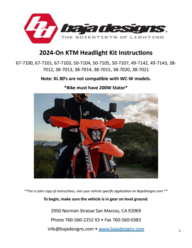 Upgrade your off-road lighting with the Baja Designs S1 “Gemini” Dual LED Headlight Kit for the 2024–2025 KTM off-road motorcycles. This premium LED moto light delivers unparalleled performance for trail riders, dual-sport enthusiasts, and desert racers looking to dominate the trails after dark. Developed in partnership with Motominded, this headlight replacement kit offers incredible vertical and horizontal light spread—providing optimal visibility across technical terrain and open desert alike. The S1 outputs a powerful 2,320 raw lumens per light, giving you precision lighting for a wide variety of riding that transforms the night into day. This S1 “Gemini” LED Dual headlight kit comes standard with our trail lens optic and spot lens, with the trail lens aiding in both vertical and horizontal light spreads that increases blend angle with smoothness across the light pattern and a spot lens for a more focused beam illuminating further down the trail. This combination provides both distance for high-speed runs and vertical spread for tight technical riding, instilling rider confidence. Our uService® technology allows riders to customize their light pattern with one of the many lens kits we offer for the S1. This kit is 100% plug-and-play thanks to the included KTM-specific connector, making installation quick and hassle-free. Whether you're racing, exploring, or trail riding, this LED headlight kit not only improves nighttime visibility but also increases daytime safety on the trail. Backed by our 30-day satisfaction guarantee and Limited Lifetime Warranty for the ultimate in purchase protection.