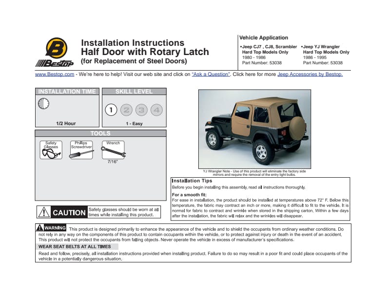 - Note: HALF DOORS are are designed for use as lower half only. Bestop Upper Door Kits can't be used in conjunction with Lower Half Doors. If you are interested in combining upper and lower doors, check out our 2-Piece Fabric Door Kits