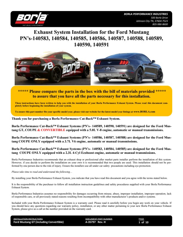 Mustang 2.3L EcoBoost/ 3.7L V6 2015-2020 Cat-Back Exhaust System S-Type Part # 140584 |