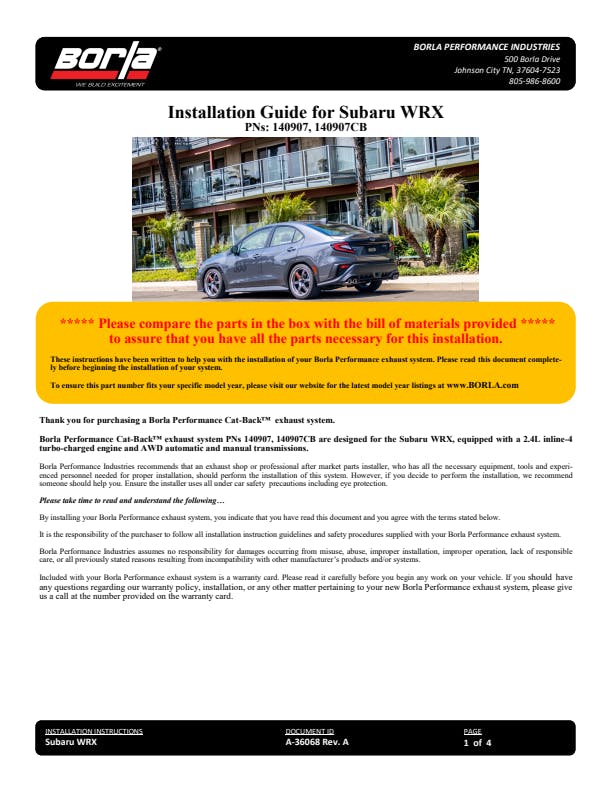This Borla(r) Cat-Back(tm) system is tuned for performance and sound for the 2.4L engine in the WRX. Our S-Type sound level is designed to bring out the Subaru engine rumble and provides an aggressive sound without any drone. This system features quad (2 per muffler assembly) 3.5" round ceramic black on T-304 stainless steel tips, but is also available with polished T-304 stainless steel tips. For ease of installation, this Cat-Back(tm) is a direct bolt on part and does not require cutting. Like all Borla(r) exhaust products, each system is handmade in the USA by master craftspeople and features premium, high-quality T-304 austenitic stainless steel construction. Ultra-smooth mandrel bends ensure maximum flow & power, and precision computer numerical control (CNC) manufacturing ensures an accurate fit. Best of all it features a Million-Mile Warranty.