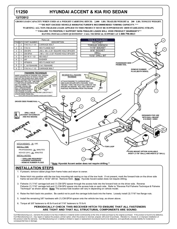 Connect to your lifestyle with a custom hitch receiver from CURT. All of our custom hitches are designed for a vehicle-specific fit, manufactured with pride, finished for industry-leading rust resistance and tested to rigorous SAE J684 standards for safety. This class 1 trailer hitch and ball mount combination is designed for a custom fit on select years of the Hyundai Accent and Kia Rio (see application info to verify fitment). The hitch integrates with the vehicle's frame and provides a useful and dependable 1-1/4" x 1-1/4" receiver. The receiver is perfect for attaching the included ball mount and towing a small trailer, or for adding cargo space with a hitch-mounted cargo carrier, bike rack or other accessory. This particular class 1 hitch is rated for 2,000 pounds gross trailer weight and 200 pounds tongue weight (never exceed the lowest-rated towing component). The ball mount included with this trailer hitch quickly and easily installs into the hitch receiver and has a 3/4" trailer ball hole (trailer ball not included). It can be mounted in the rise or drop position to promote level towing. Like all CURT custom hitches, this class 1 hitch is protected with our co-cured finishing process. It is descaled for a smooth surface, immersed in liquid A-coat for rust resistance inside and out, covered with a durable black powder coat and finally co-cured for an industry-leading rust, chip and UV-resistant shield. No matter where you're headed or which season of the year you’re towing in, this CURT hitch is equipped for long-lasting resilience to the elements. It features an open-back receiver for easy cleaning, and it comes with all the hardware necessary for the installation.