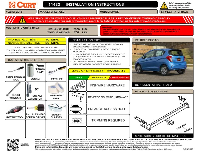 Connect to your lifestyle with a custom hitch receiver from CURT. All of our custom hitches are designed for a vehicle-specific fit, manufactured with pride, finished for industry-leading rust resistance and tested to rigorous SAE J684 standards for safety. This class 1 trailer hitch and ball mount combination is designed for a custom fit on select years of the Chevrolet Spark (see application info to verify fitment). The hitch integrates with the vehicle's frame and provides a useful and dependable 1-1/4" x 1-1/4" receiver. The receiver is perfect for attaching the included ball mount and towing a small trailer, or for adding cargo space with a hitch-mounted cargo carrier, bike rack or other accessory. This particular class 1 hitch is rated for 2,000 pounds gross trailer weight and 200 pounds tongue weight (never exceed the lowest-rated towing component). The ball mount included with this trailer hitch quickly and easily installs into the hitch receiver and has a 3/4" trailer ball hole (trailer ball not included). It can be mounted in the rise or drop position to promote level towing. Like all CURT custom hitches, this class 1 hitch is protected with our co-cured finishing process. It is descaled for a smooth surface, immersed in liquid A-coat for rust resistance inside and out, covered with a durable black powder coat and finally co-cured for an industry-leading rust, chip and UV-resistant shield. No matter where you're headed or which season of the year you’re towing in, this CURT hitch is equipped for long-lasting resilience to the elements. It features an open-back receiver for easy cleaning, and it comes with all the hardware necessary for the installation.