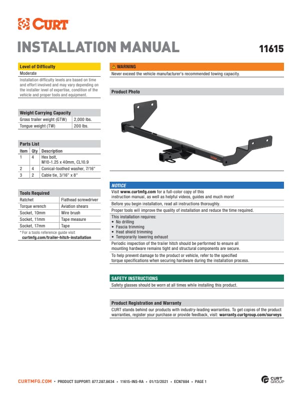 However you define adventure -- whether it's climbing onto the back of a mountain bike, hunting from the top of a tree stand or camping with the family a long way from nowhere -- CURT class 1 hitches provide a light-duty towing receiver to help you Bring It. Each is made to fit a specific vehicle, providing easier installation, a better fit and optimal towing capacity. Custom class 1 trailer hitches are available for a variety of smaller vehicle types, including the compact car, crossover, minivan and small SUV. This particular class 1 hitch is designed to be a custom hitch for certain years of the Kia Forte (to verify vehicle compatibility, see the CURT application guide at curtmfg.com). Tested in accordance with SAE J684, it offers a weight carrying capacity of 2,000 lbs. GTW and 200 lbs. TW. It is equipped with 1-1/4" receiver tube opening to accept a ball mount shank or other hitch mount. This class 1 hitch also comes with all necessary mounting hardware. With its lightweight design and smaller receiver tube size, a class 1 hitch is especially useful for adding cargo space with a hitch-mounted bike rack or cargo carrier. They can also typically be used to tow small trailers such as a utility trailer, kayak trailer or teardrop camper (never exceed the lowest weight capacity of any towing component; i.e. the vehicle, hitch, trailer, etc). Though CURT class 1 trailer hitches are only intended for light-duty towing, we apply the same principles of quality as we do to the rest of our rear mount hitches. Each class 1 hitch is made with hands-on engineering, high-strength steel and precise welding. We use a co-cured finish of liquid A-coat, inside and out, and durable black powder coat to provide a lasting defense against rust, chips and UV rays.