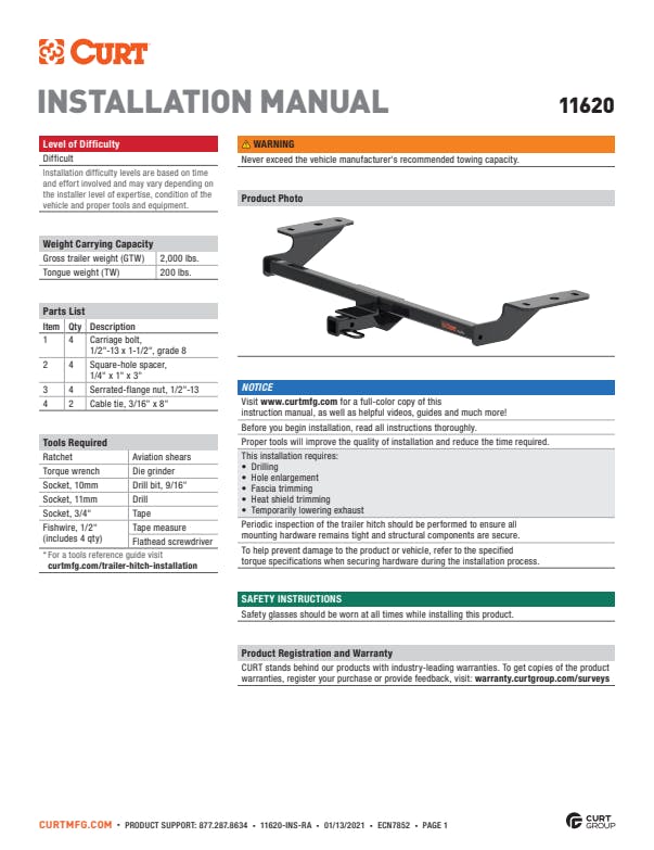 However you define adventure -- whether it's climbing onto the back of a mountain bike, hunting from the top of a tree stand or camping with the family a long way from nowhere -- CURT class 1 hitches provide a light-duty towing receiver to help you Bring It. Each is made to fit a specific vehicle, providing easier installation, a better fit and optimal towing capacity. Custom class 1 trailer hitches are available for a variety of smaller vehicle types, including the compact car, crossover, minivan and small SUV. This particular class 1 hitch is designed to be a custom hitch for certain years of the Kia Forte (to verify vehicle compatibility, see the CURT application guide at curtmfg.com). Tested in accordance with SAE J684, it offers a weight carrying capacity of 2,000 lbs. GTW and 200 lbs. TW. It is equipped with 1-1/4" receiver tube opening to accept a ball mount shank or other hitch mount. This class 1 hitch also comes with all necessary mounting hardware. With its lightweight design and smaller receiver tube size, a class 1 hitch is especially useful for adding cargo space with a hitch-mounted bike rack or cargo carrier. They can also typically be used to tow small trailers such as a utility trailer, kayak trailer or teardrop camper (never exceed the lowest weight capacity of any towing component; i.e. the vehicle, hitch, trailer, etc). Though CURT class 1 trailer hitches are only intended for light-duty towing, we apply the same principles of quality as we do to the rest of our rear mount hitches. Each class 1 hitch is made with hands-on engineering, high-strength steel and precise welding. We use a co-cured finish of liquid A-coat, inside and out, and durable black powder coat to provide a lasting defense against rust, chips and UV rays.