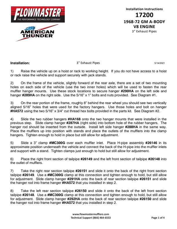 This Crossmember-Back American Thunder system is custom designed for high horsepower and large cubic inch engines in 1968-1972 GM A-Bodies with a V8 engine. It's a true-dual exhaust system featuring all mandrel-bent 3.00-inch aluminized steel tubing with a built-in H-pipe crossover assembly flowing into a pair of large cased Super 40 Series performance mufflers for maximum power and a deep powerful aggressive exhaust note. The large 3.00-inch mandrel-bent tailpipes are custom bent to tuck up high above the rear end and exit with a slight turn down under the rear bumper. The system is constructed from aluminized steel and includes all necessary hardware and hangers for installation and is covered by our 3-year Limited Warranty. This system is also available in Stainless steel and comes with a Lifetime Limited Warranty, check out part# 817200.