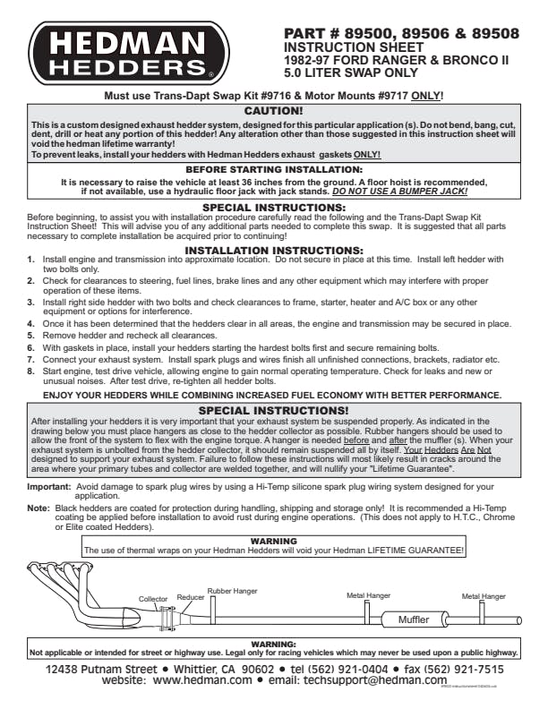 Hedman Hedders is so confident in the quality of its headers that these headers are factory backed by a Limited Lifetime Warranty. These headers have a high temperature, SATIN-BLACK ceramic finish that resists corrosion, and can withstand temperatures up to 1400 degree F. This finish is covered by a 5-year factory warranty, in addition to Hedman's standard lifetime header warranty.