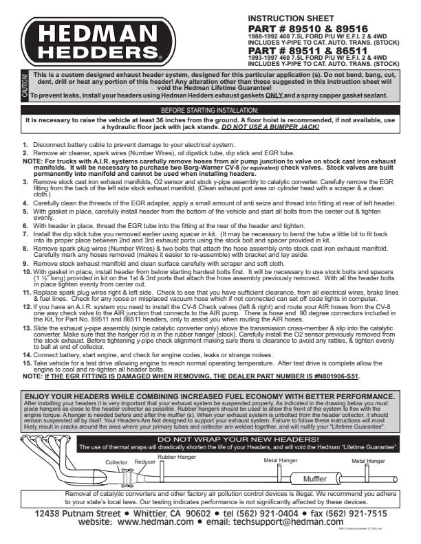 Hedman Hedders has been manufacturing quality headers in the USA since 1954, and they've been manufacturing Ford truck headers decades. Each set uses mild steel, smooth flowing, CNC mandrel bent tubes, that are hand-welded to ensure each pair is identical to the next. Hedman's unique, gasketless ball and socket collector design allows your exhaust system to bolt up to these Ford 7.5L (460 CID) headers, even if it is not perfectly aligned with the header collectors.