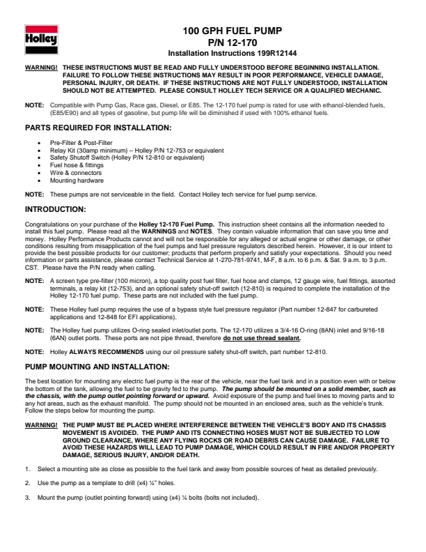 - Compatible with Flex Fuel (E85/E90) and all types of gasoline (100% Alcohol fuels may diminish fuel pump life)