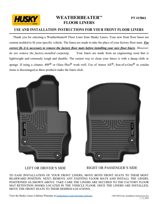 Expand the Husky Liner protection you love from bumper to bumper, with Weatherbeater? Cargo Liners. These all-weather, any-conditions liners are ready for anything you throw in the back and stand up to even the toughest spills. Husky?s rubberized DuraGrip? surface and ProGard? formula keep cargo protected with durable flexibility, and no shifting around. Installs in minutes and stays in place until you?re ready to take out and clean. Available in black, gray, or tan for a factory look to match your vehicle?s interior. Backed by Husky Liners Guaranteed for Life. Proudly made in the U.S.A.