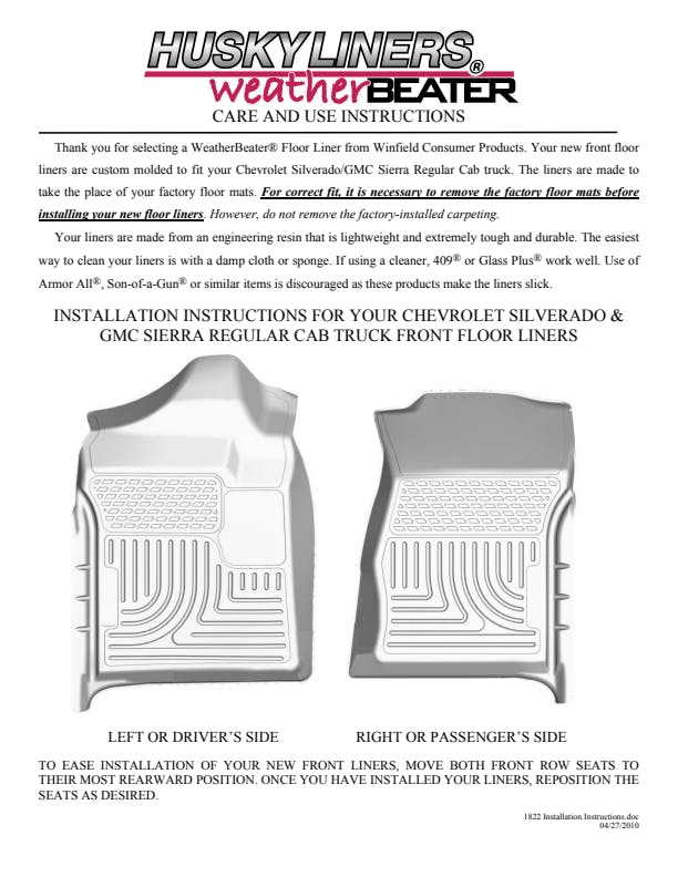 No hassle lifetime guarantee. For details: HuskyLiners.com/ForLife, Our FormFit Design™ process perfectly forms each liner to the detailed contours of your specific ride., Our exclusive StayPut Cleats™ help keep your liners securely in place., Sporty, rugged, and built for a lifetime of non-stop abuse. Put unbeatable all-weather toughness to work on your floor., For applicable trucks, WeatherBeater™ Liners offer protection that extends all the way to your rear seats. So go ahead, lift the seats and leave them up, load after load. Husky's got your floors, and your back, no matter what the road brings your way., When we say it's "guaranteed for life" that is exactly what we mean. No hassles, no guff. If you have a problem with this or any Husky product, we'll replace it., Made in the USA., Easy to install, remove, and clean. Just yank it out, hose it down and carry on., Protection prevents stains & soiling of your carpeted areas., Contains a spill until you can pull it out, wash it off--- good as new! |