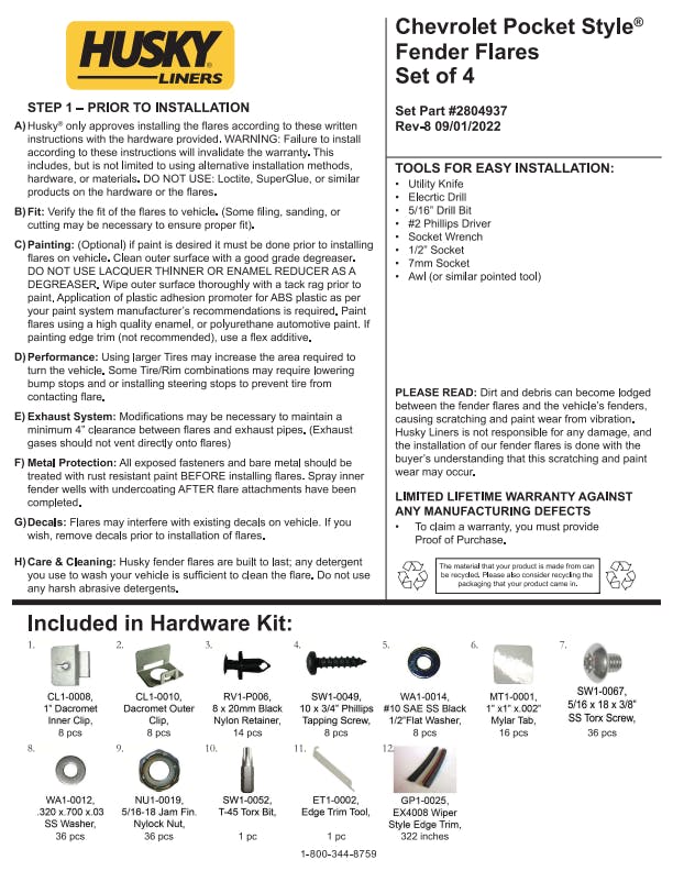 - Pocket Style fender flares are covered by Husky Liners Limited Lifetime Warranty. Featuring Husky's legendary durability, so they're built to last. Proudly made in the USA with global materials.