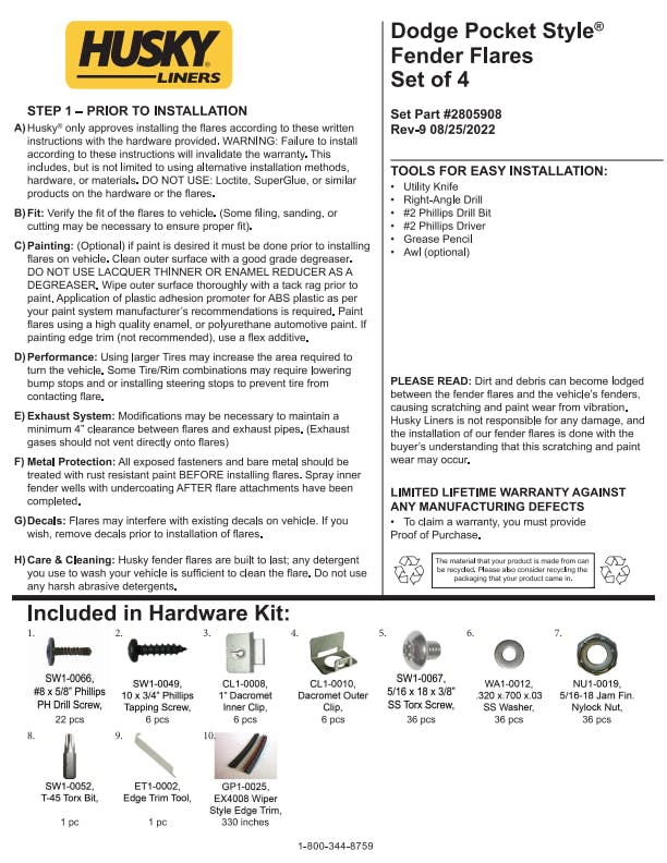 - Pocket Style fender flares are covered by Husky Liners Limited Lifetime Warranty. Featuring Husky's legendary durability, so they're built to last. Proudly made in the USA with global materials.