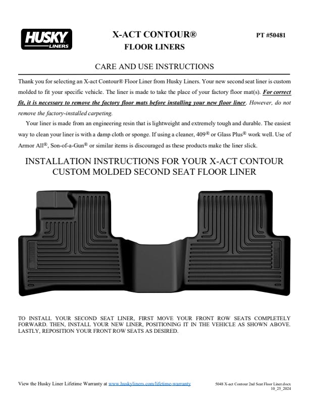 Nothing fits your vehicle better or protects longer than Husky X-act Contour?. These liners combine laser-scanned, exact fit with a no-slip, DuraGrip? surface and a softer feel. Plus, the rock-solid stability delivered by your vehicle?s factory retention posts, and our StayPut? Nibs for a no-slip, no-slide, surface with absolutely zero compromise in protection. They?re built to stand up to whatever you?re laying down? including chemicals like battery acid and oil, with our FormFit Edge? to keep whatever spills contained for easy cleanup. Available in black. Built for a lifetime of rugged abuse, warrantees the same.