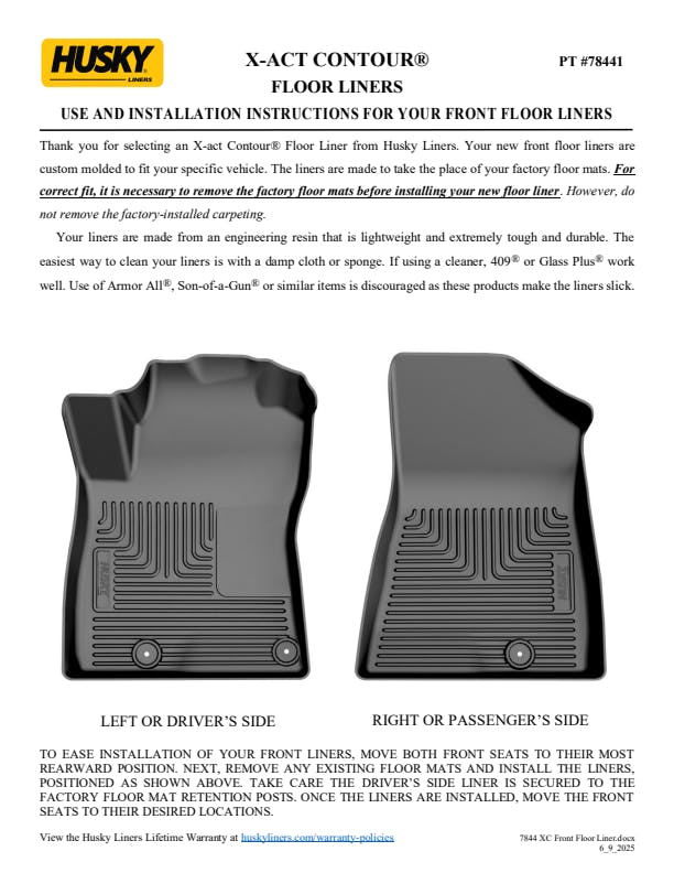 Nothing fits your vehicle better or protects longer than Husky X-act Contour?. These liners combine laser-scanned, exact fit with a no-slip, DuraGrip? surface and a softer feel. Plus, the rock-solid stability delivered by your vehicle?s factory retention posts, and our StayPut? Nibs for a no-slip, no-slide, surface with absolutely zero compromise in protection. They?re built to stand up to whatever you?re laying down? including chemicals like battery acid and oil, with our FormFit Edge? to keep whatever spills contained for easy cleanup. Available in black. Built for a lifetime of rugged abuse, warrantees the same.