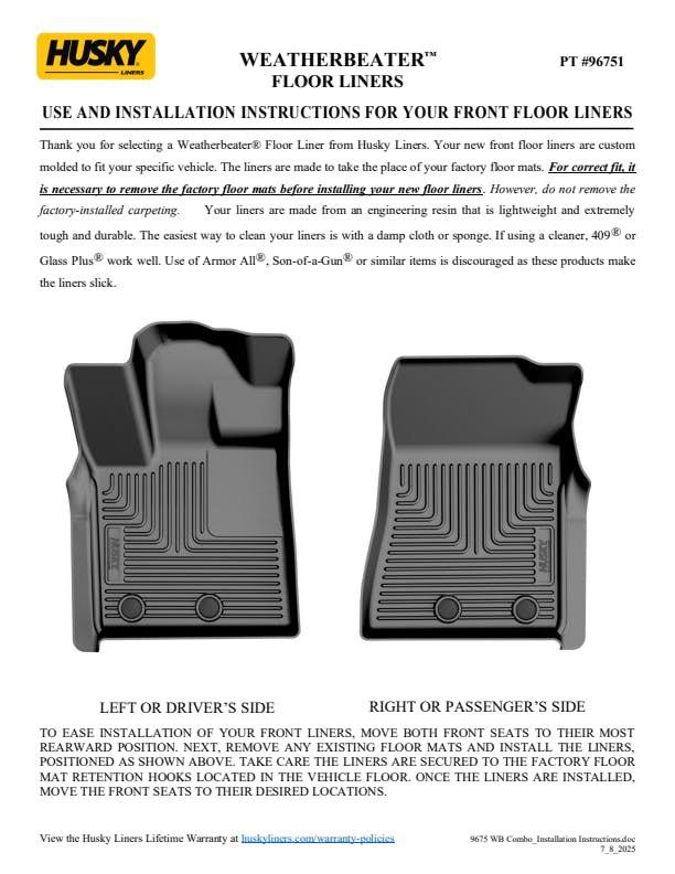 The original all-weather liner is ready, come hell or hot coffee. The Weatherbeater?s construction is a no-slip zone with zero edge curl, and its Stay Put Nibs keep it firmly anchored underfoot. It stands up to chemicals like gas, oil and battery acid, and stays tough and flexible, even under extreme temperatures. Its laser-scanned, FormFit Design? gives your truck, van or SUV an ultra-clean look with easy cleanup to match, while its patented, FormFit Edge? keeps spills contained, carpets unstained. It?s unbeatable Husky protection for life, warrantied the same. Proudly made in the USA.