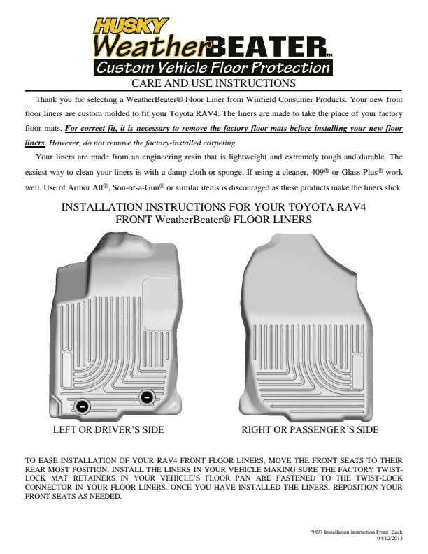 No hassle lifetime guarantee. For details: HuskyLiners.com/ForLife, For applicable trucks, WeatherBeater™ Liners offer protection that extends all the way to your rear seats. So go ahead, lift the seats and leave them up, load after load. Husky's got your floors, and your back, no matter what the road brings your way., Over vinyl or carpet, our StayPut™ Cleats firmly lock to your factory anchors. It's rock-steady stability underfoot, only by Husky., Sporty, rugged, and built for a lifetime of non-stop abuse. Put unbeatable all-weather toughness to work on your floor., Made in the USA., When we say it's "guaranteed for life" that is exactly what we mean. No hassles, no guff. If you have a problem with this or any Husky product, we'll replace it., Proudly made in the USA., Easy to install, remove, and clean. Just yank it out, hose it down and carry on., Protection prevents stains & soiling of your carpeted areas., Contains a spill until you can pull it out, wash it off--- good as new! |
