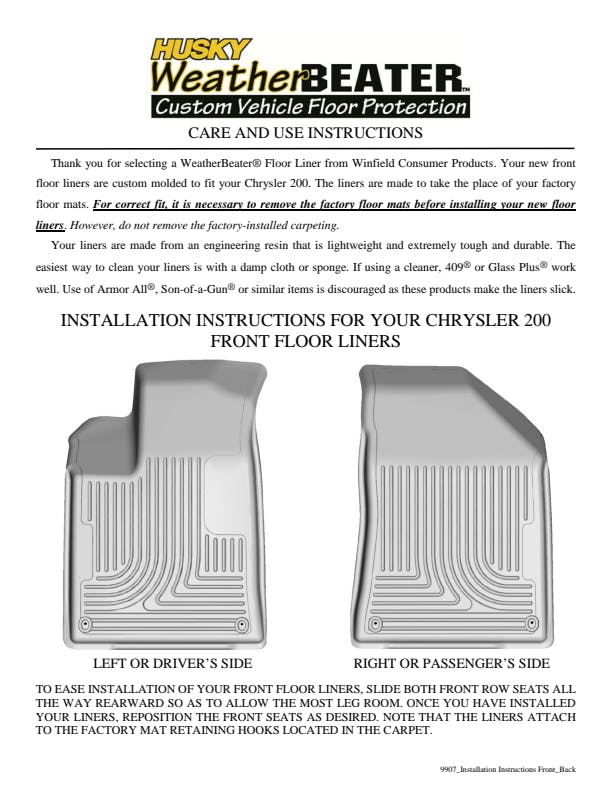 The original all-weather liner is ready, come hell or hot coffee. The Weatherbeater?s construction is a no-slip zone with zero edge curl, and its Stay Put Nibs keep it firmly anchored underfoot. It stands up to chemicals like gas, oil and battery acid, and stays tough and flexible, even under extreme temperatures. Its laser-scanned, FormFit Design? gives your truck, van or SUV an ultra-clean look with easy cleanup to match, while its patented, FormFit Edge? keeps spills contained, carpets unstained. It?s unbeatable Husky protection for life, warrantied the same. Proudly made in the USA.