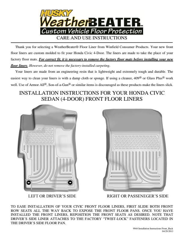 Our FormFit Design™ process perfectly forms each liner to the detailed contours of your specific ride., For applicable trucks, WeatherBeater™ Liners offer protection that extends all the way to your rear seats. So go ahead, lift the seats and leave them up, load after load. Husky's got your floors, and your back, no matter what the road brings your way., Over vinyl or carpet, our StayPut™ Cleats firmly lock to your factory anchors. It's rock-steady stability underfoot, only by Husky., Sporty, rugged, and built for a lifetime of non-stop abuse. Put unbeatable all-weather toughness to work on your floor., Made in the USA., When we say it's "guaranteed for life" that is exactly what we mean. No hassles, no guff. If you have a problem with this or any Husky product, we'll replace it., Proudly made in the USA., Easy to install, remove, and clean. Just yank it out, hose it down and carry on., Protection prevents stains & soiling of your carpeted areas., Contains a spill until you can pull it out, wash it off--- good as new! |