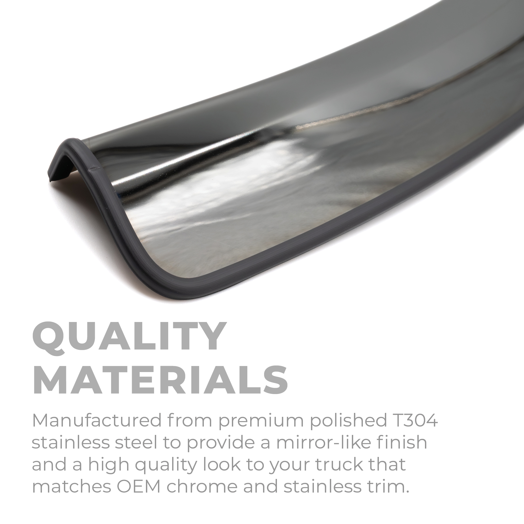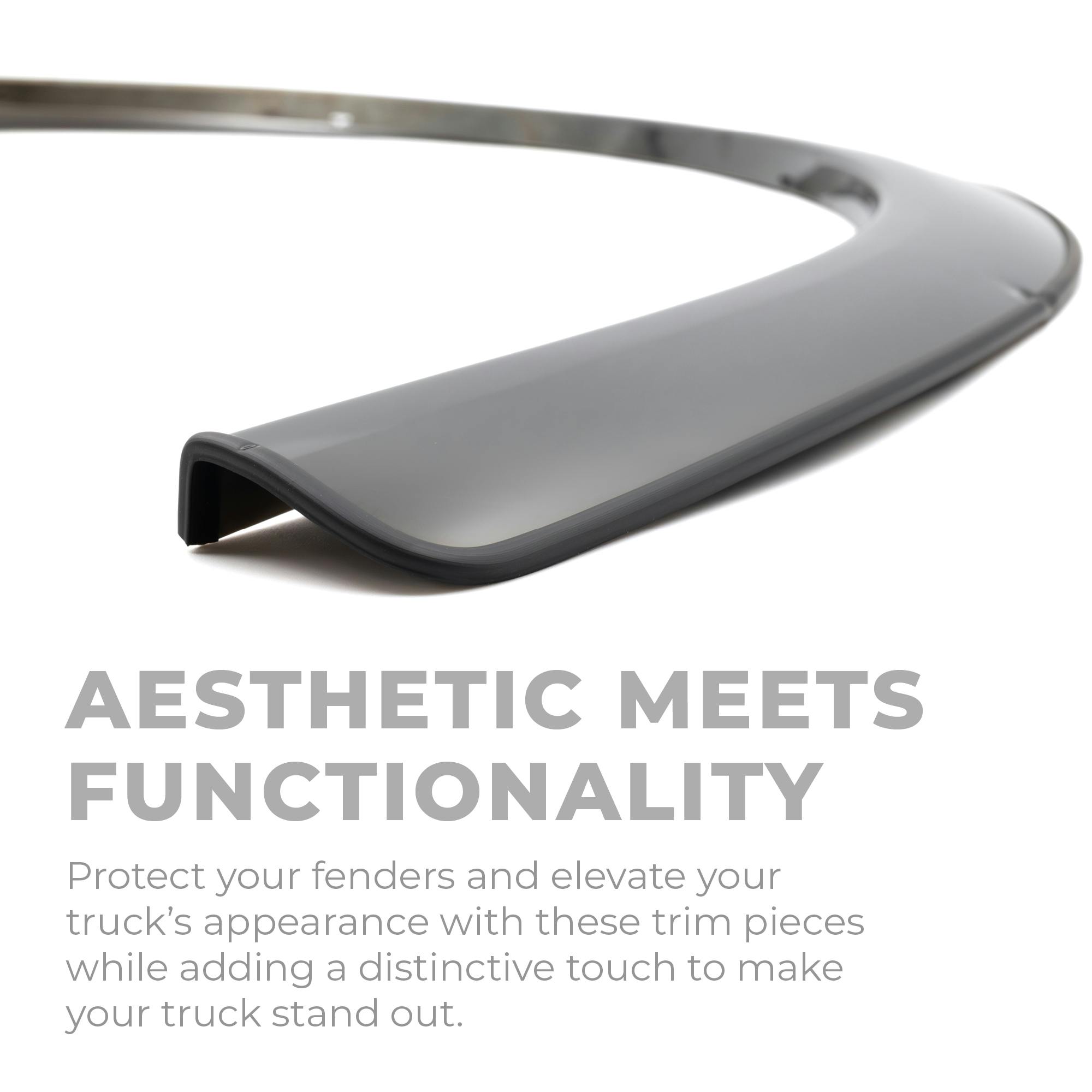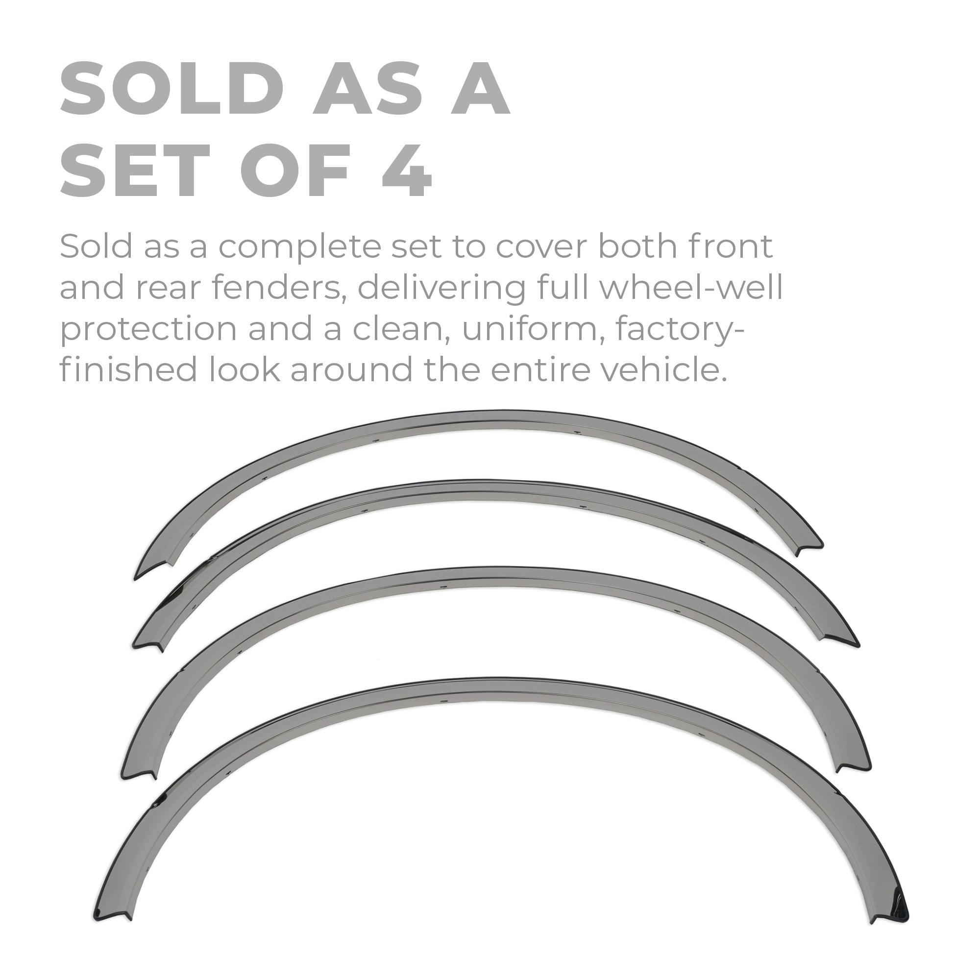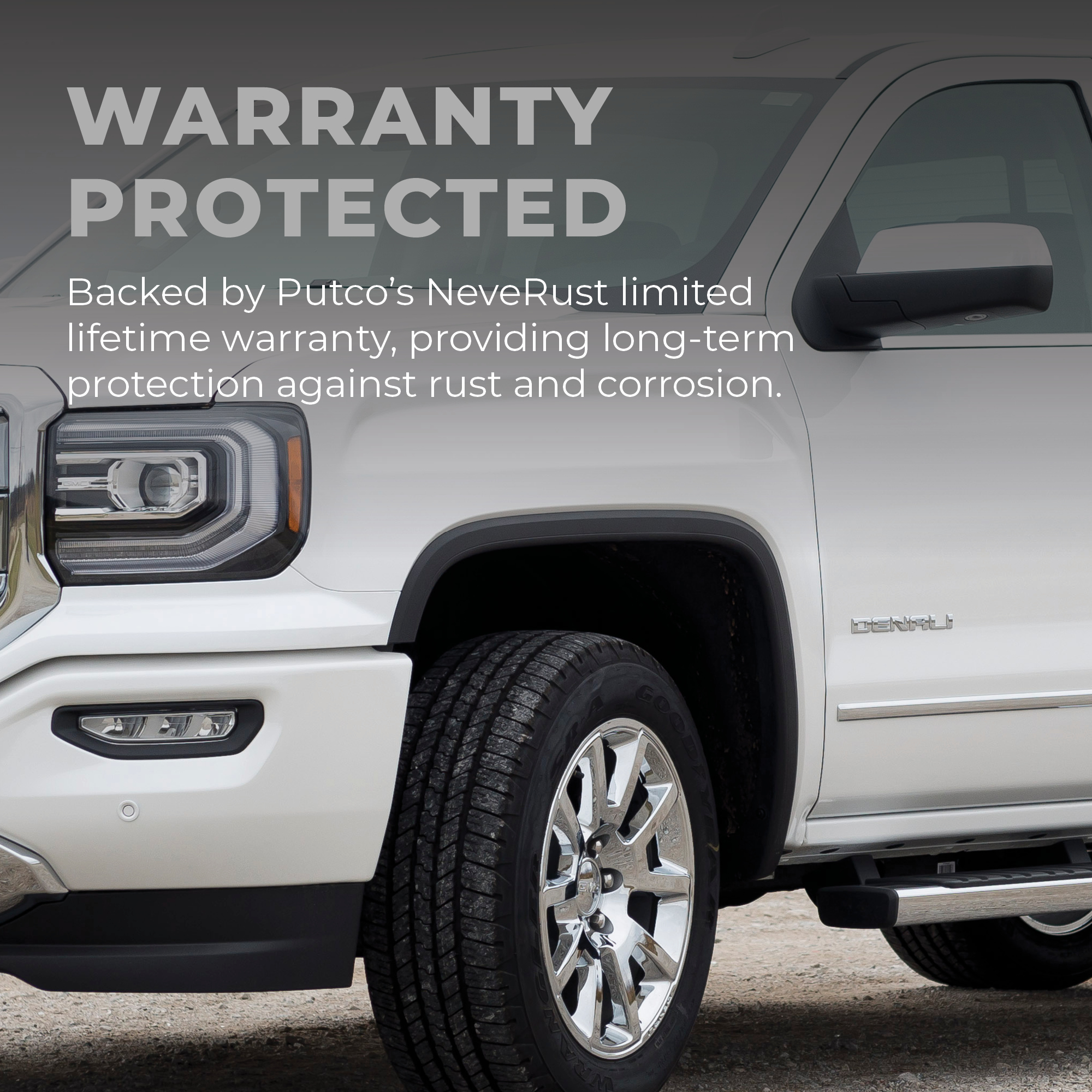 Protect your fenders and give your truck a little extra shine with the Putco Black Stainless Steel Fender Trim Kit. When you add this black fender trim you will not only protect your paint from debris and door dings but you will also make your ride stand out from the rest. Each kit is constructed out of T304 Stainless Steel that is polished to a mirror-like finish, the black flawless finish is then achieved by a very special chemical vapor deposition process that each kit goes through.Each kit is specifically designed to fit your truck, there is nothing universal about this product. Expect a direct-fit, fast & easy installation. This product is also backed with our premium NeveRust™ Limited Lifetime Warranty. Designed in the USA by Putco Inc. Des Moines, IA
