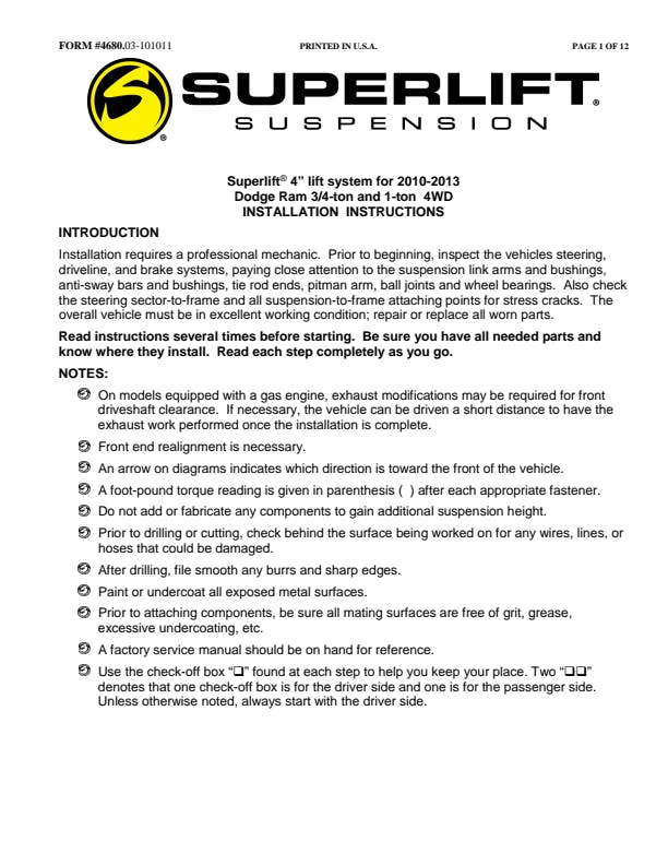 4 inch Lift Kit - 2010-2013 Dodge Ram 2500 and 2010-2012 3500 4WD - Diesel Engine - with Superlift Shocks