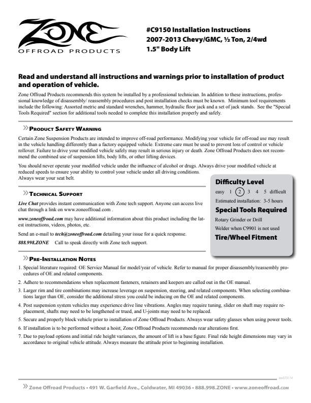 Give your Chevrolet/GMC 1500 truck that extra boost for larger tires while maintain the ride quality and handling characteristics with this 1.5 body lift from Zone Offroad. This kit raises the body up off the frame to allow clearance for larger tires while maintaining factory cab-to-bed body lines and installing quickly and easily. It includes indestructible body mount blocks, high quality hardware, front bumper brackets, radiator brackets, bed support spacers, fuel filler extension and more.
